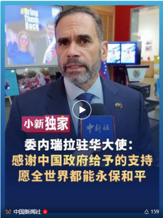 综合中新社、直新闻消息,2月3日,委内瑞拉驻华大使塞瓦略斯在接受采访时表示,委方由衷感谢中国政府给予的坚定支持,中方通过公开表态为主权国家发声,这份支持让委方倍感珍贵。